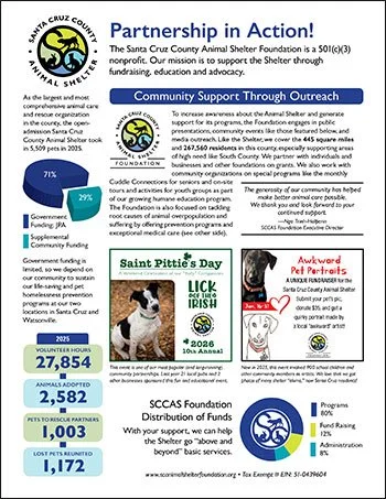 The Santa Cruz County Animal Shelter Foundation’s mission is to support the Shelter through education, advocacy and fundraising. It helps to cover the costs for core services such as animal control; licensing and rabies vaccinations; safe housing for strays and surrenders; and intervention in animal abuse cases. As a nonprofit 501(c)3, the Foundation is also proactive in tackling root causes of animal overpopulation and suffering by offering prevention programs, exceptional medical care, humane education and community outreach. The Foundation's key proactive initiatives – spay/neuter clinics, training classes, and public advocacy – help animals and their guardians beyond the Shelter’s doors. These are the preventive programs that are the agents of change and address root causes of animal overpopulation and suffering.